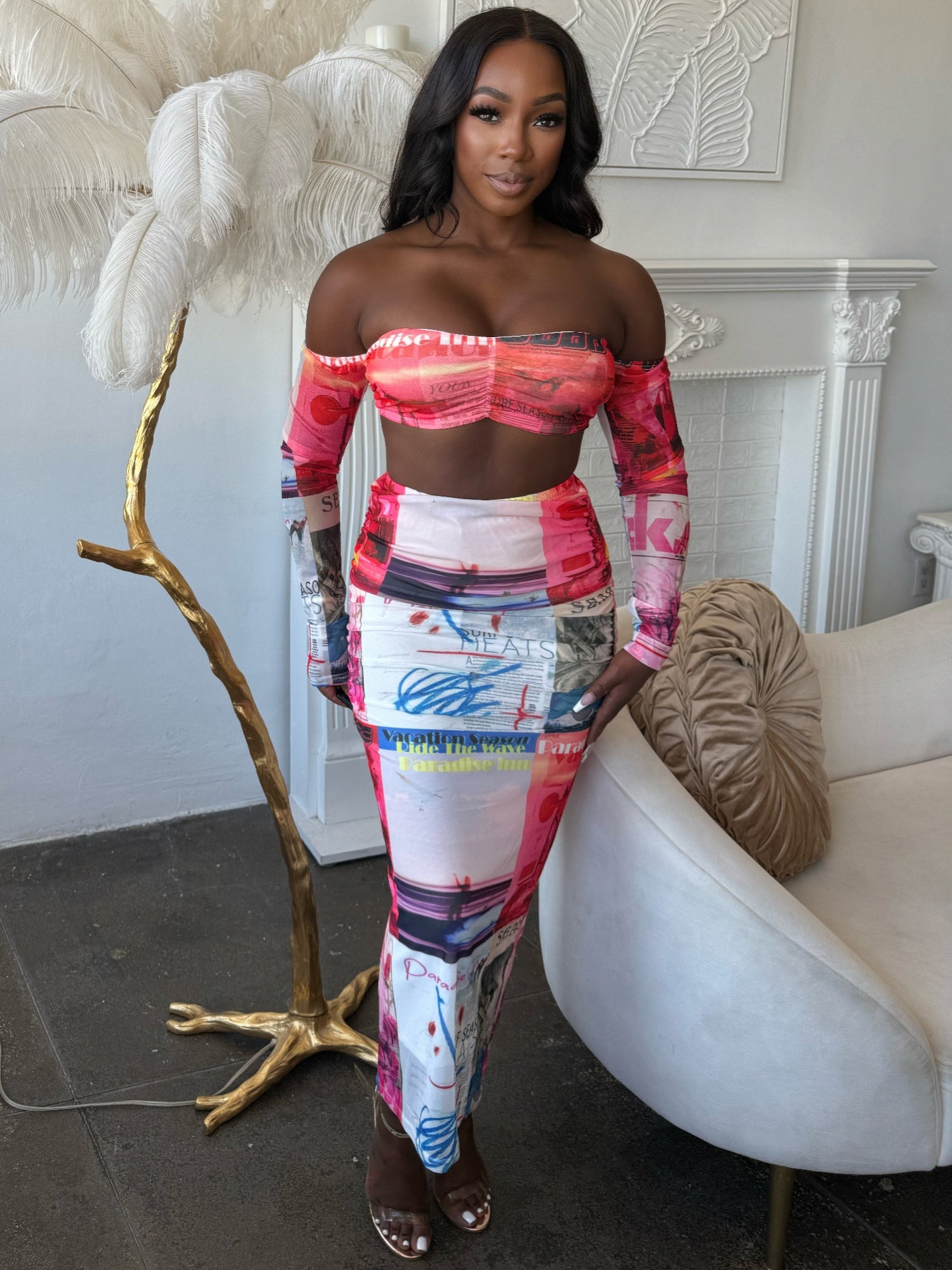 The Paradise Inn Mesh Set redefines meshwear with a bold, editorial twist. Featuring a modern magazine-style graphic print in vibrant reds, pinks, and blues, this two-piece set is a statement in both color and design. The long-sleeve mesh top brings a sheer, lightweight feel, while the matching lined bottoms offer coverage without compromising style. With its artsy streetwear-meets-high-fashion vibe, this set is made for those who lead with confidence and creativity. Perfect for festivals, city strolls, or layered resort looks, it's a standout addition to the Paradise capsule.